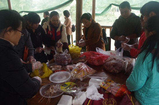 10:30分,我們正式抵達(dá)目的地“竹泉島山莊”,大家紛紛參與到午餐的準(zhǔn)備活動中,生火、穿菜、刷油、配料、烤串……,大家紛紛施展各自拿手絕活,忙得不亦樂乎,不一會大家親手烤制的肉串就飄出陣陣誘人的香氣。太陽很應(yīng)景在此刻從云層中鉆出,金色的光芒透過樹蔭照在每個朝氣蓬勃的笑臉上。